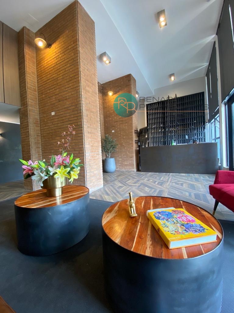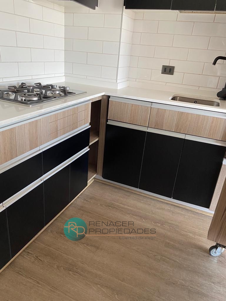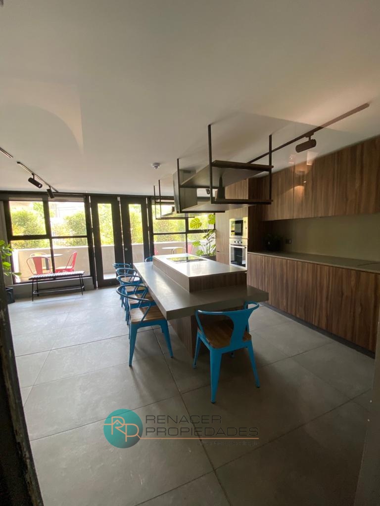 El hall de acceso destaca con detalles en muros de ladrillo y un área de recepción. La cocina está integrada al espacio principal y equipada con encimera de cuatro quemadores, muebles en tonos madera y negro, y una mesada central tipo isla.