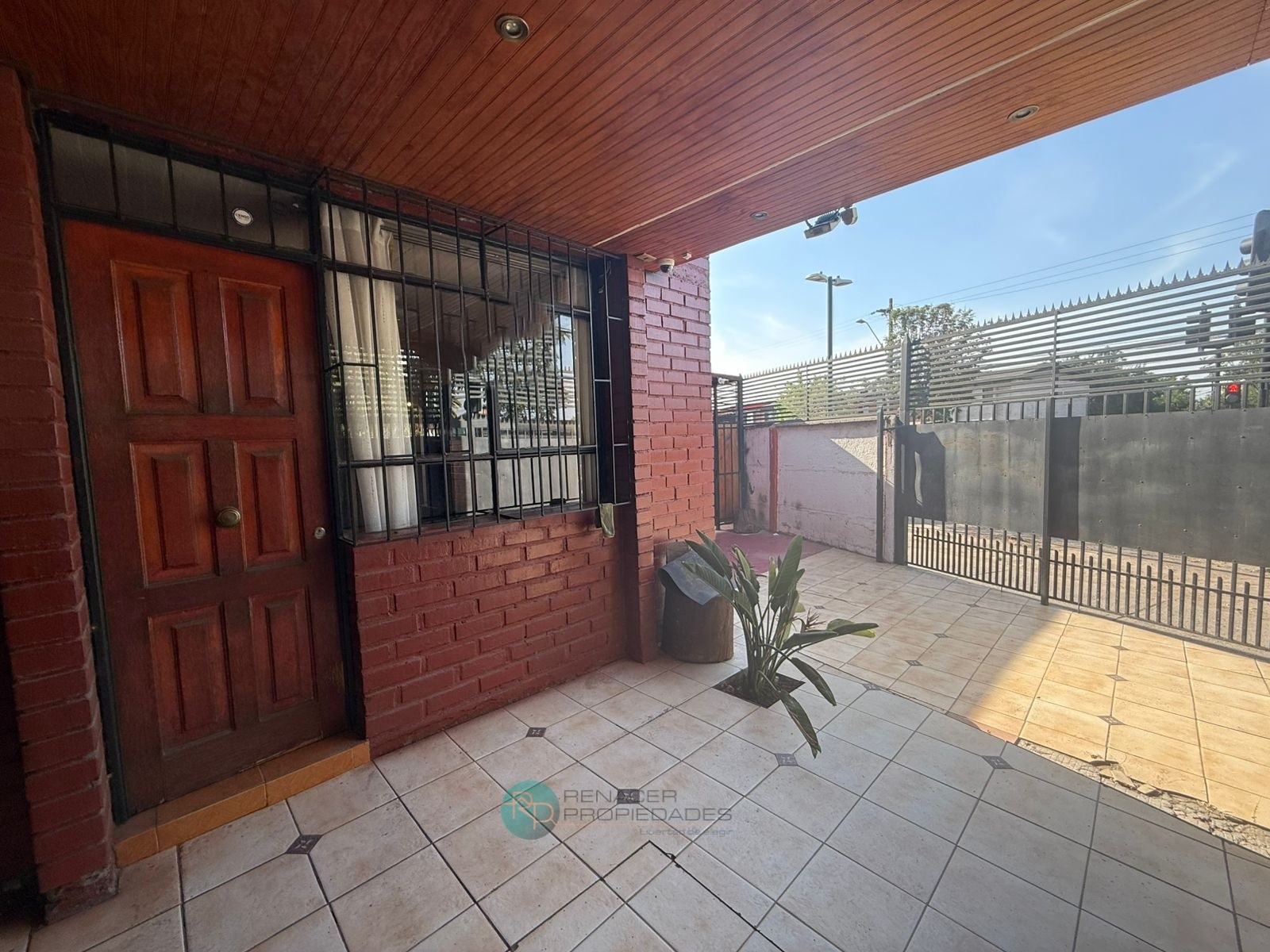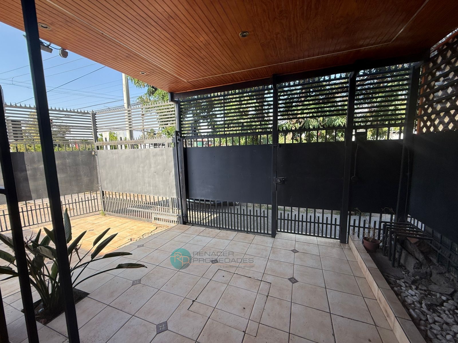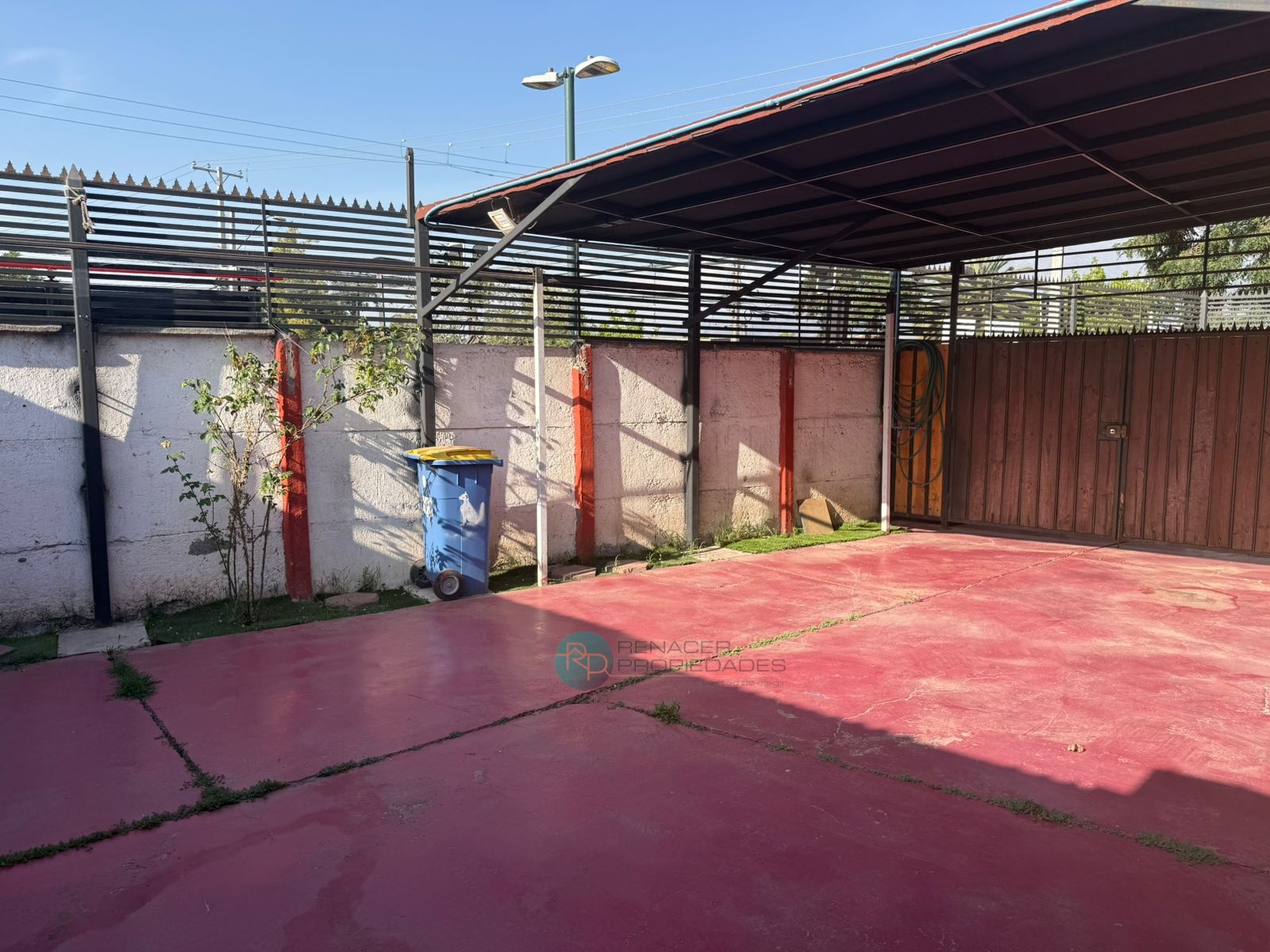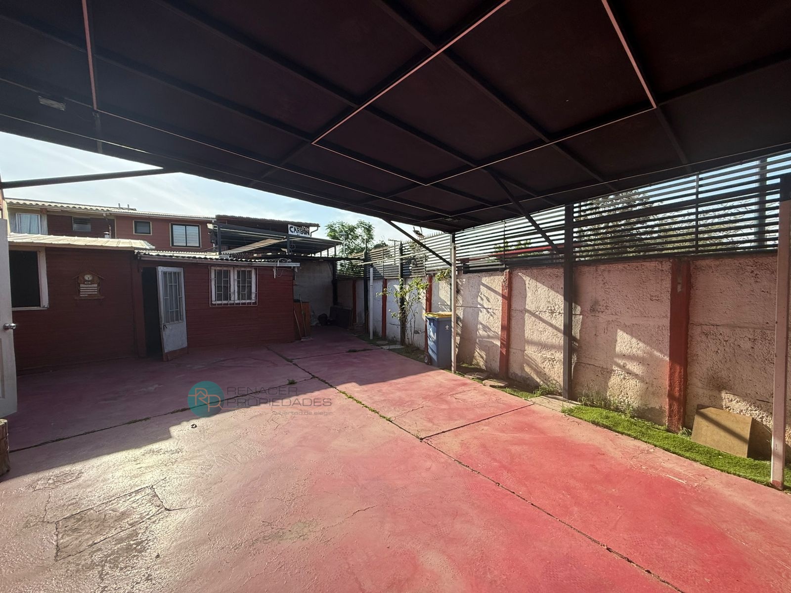 Gran sector de estacionamientos y patio pavimentado, con cobertizo metálico, que permite recibir varios autos o habilitar terrazas y áreas de trabajo. Rejas altas, portón metálico y antejardín en cerámica, lo que aporta seguridad y buena presencia hacia la calle.